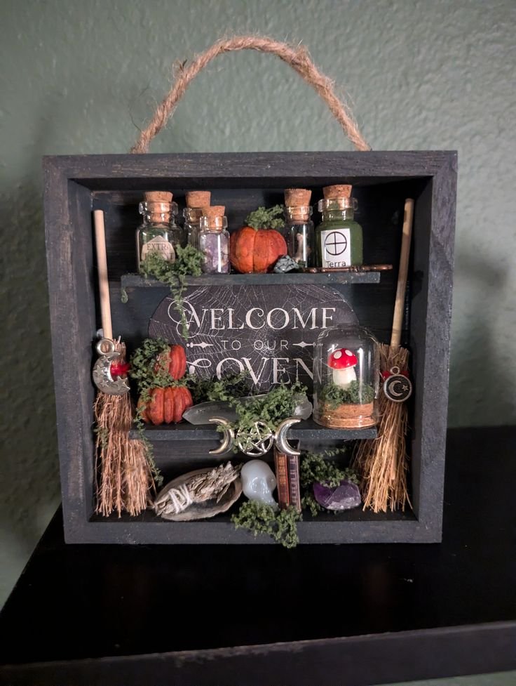 Create a shadow box with tiny Halloween items—keys, lace, feathers, dried flowers, coins—and hang it as art.