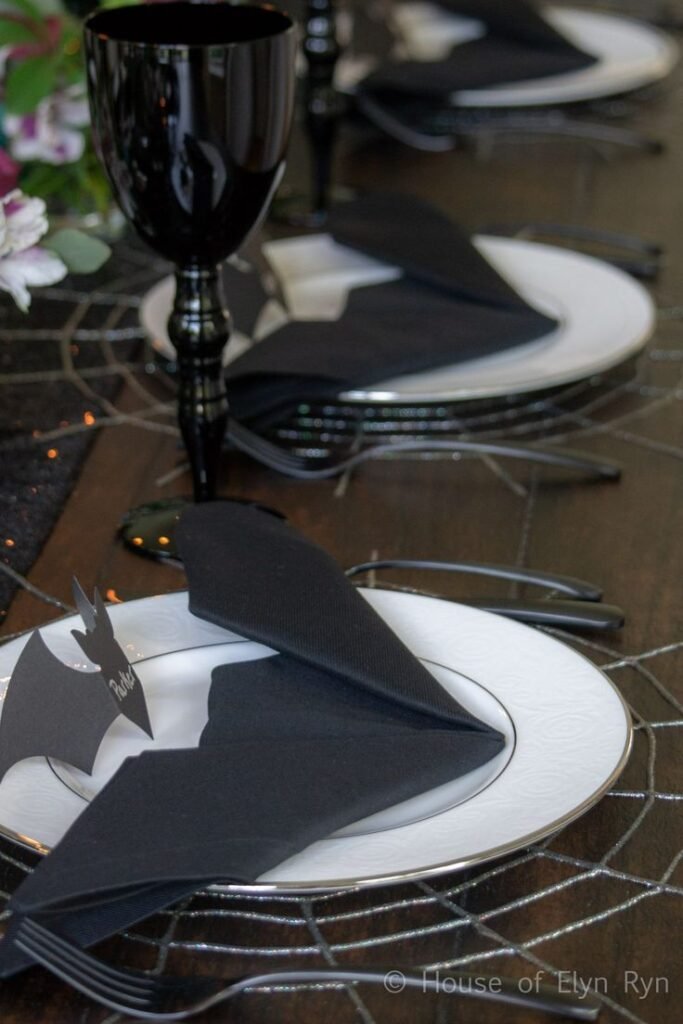 Cut a spiderweb pattern into black felt or lace to create a spooky table runner. You can also layer black tulle over a white tablecloth and scatter plastic spiders across it for a similar effect.