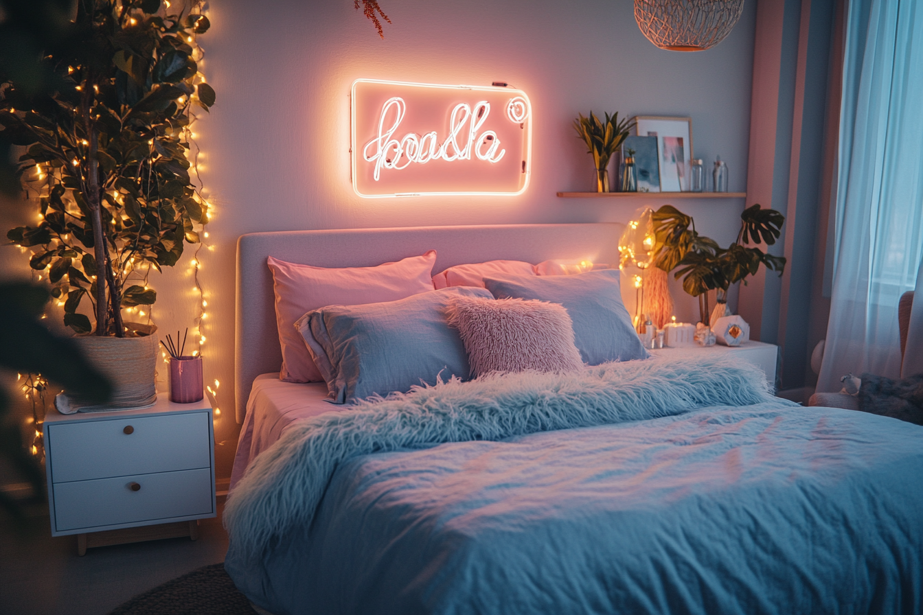 Neon or LED signs bring a trendy and modern vibe. A custom neon sign with your name or favorite quote makes the room feel personal. Soft pink or white LED lights add a warm and stylish glow.
