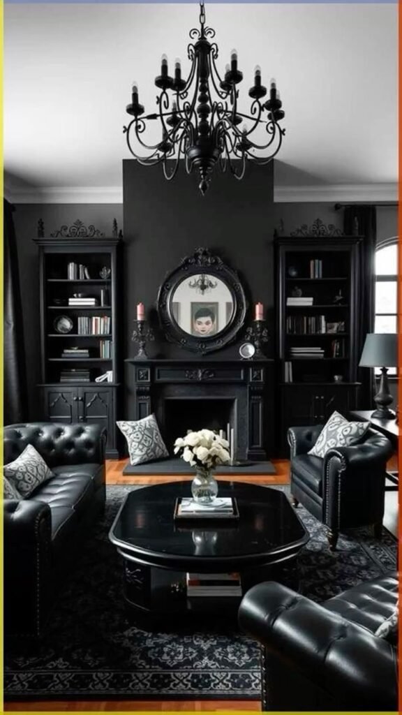 Can you really go all black in a small space? Absolutely—if you do it wisely. Choose one or two accent walls in matte black or deep plum, and balance them with lighter gothic neutrals like bone white, grey, or antique gold.