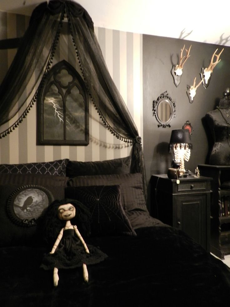 Try wall sconces with vintage finishes, table lamps with lace shades, or string lights wrapped in tulle. Candles, especially in black or blood red, are always welcome.