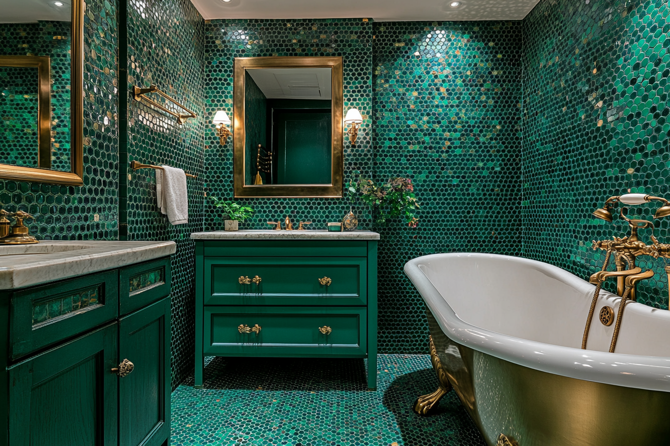Green mosaic tiles add texture and intricate detailing, making them ideal for feature walls or shower areas. A mix of emerald and gold mosaics creates a luxurious, regal effect.