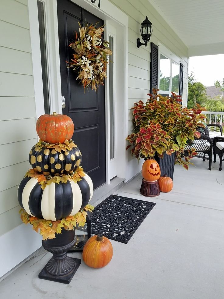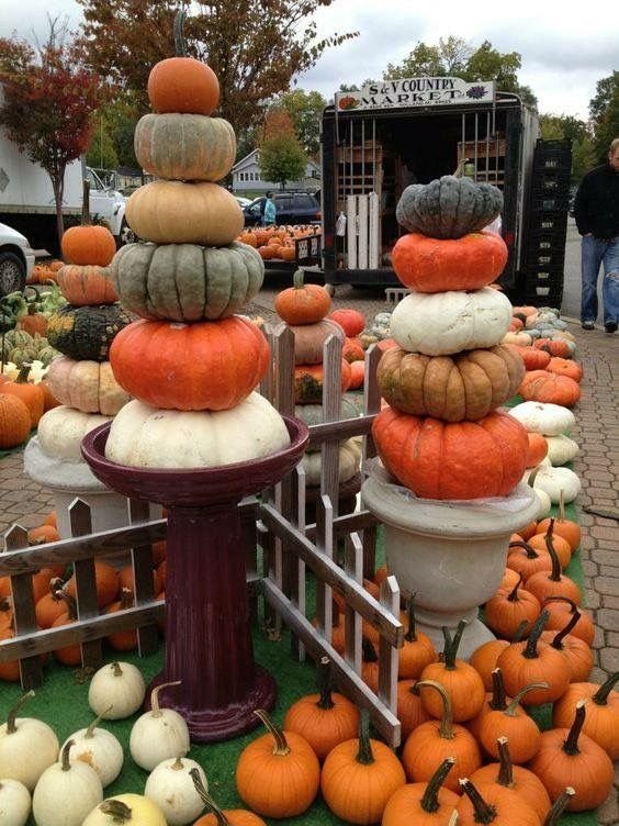 Stack 2–3 pumpkins inside a tall garden planter. Add moss or leaves in between layers. Use artificial pumpkins if you want it to last all season.