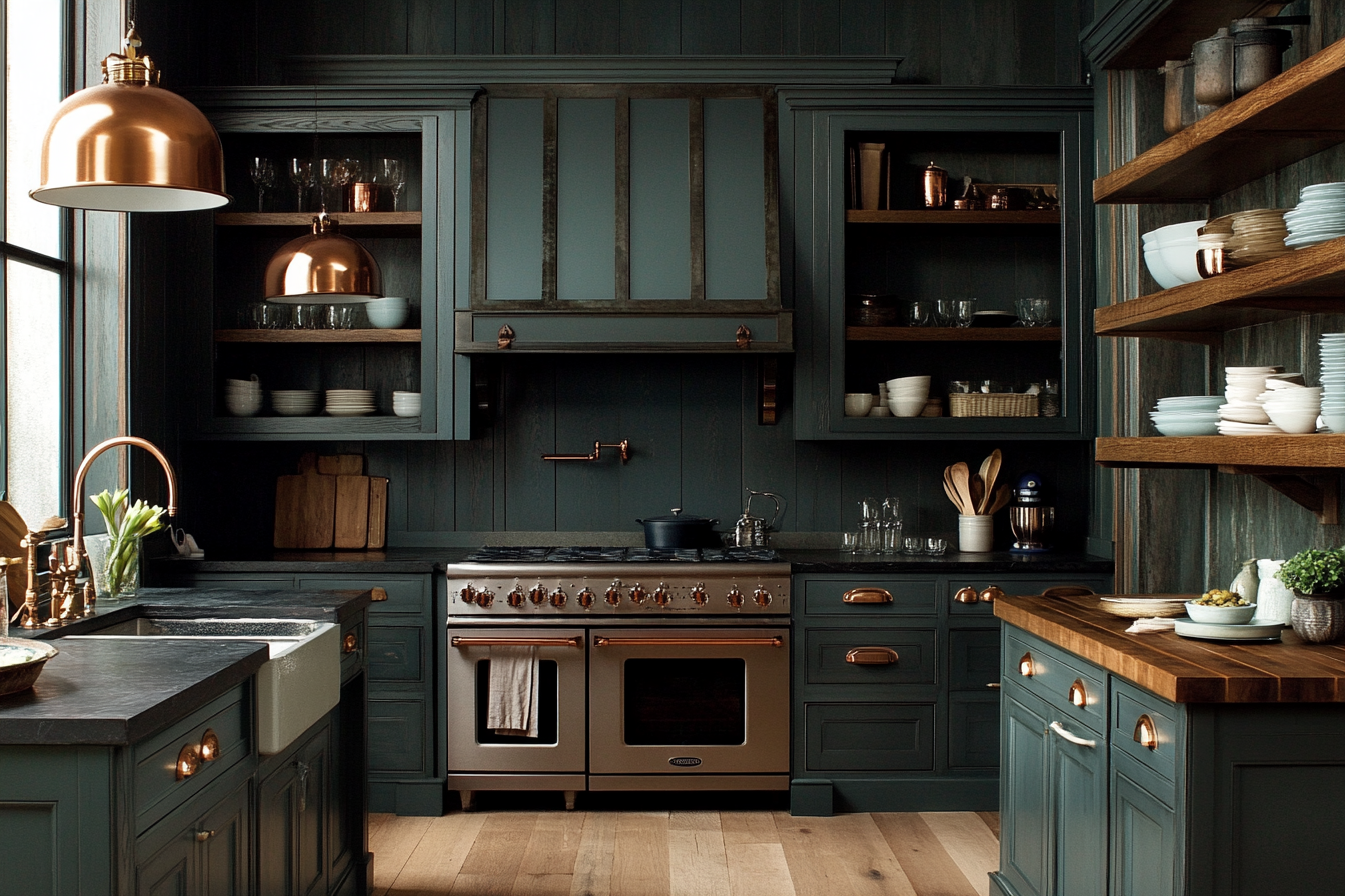 Blue gray gives your kitchen a calm, modern base. Copper stands out through hardware or lighting for a chic finish.