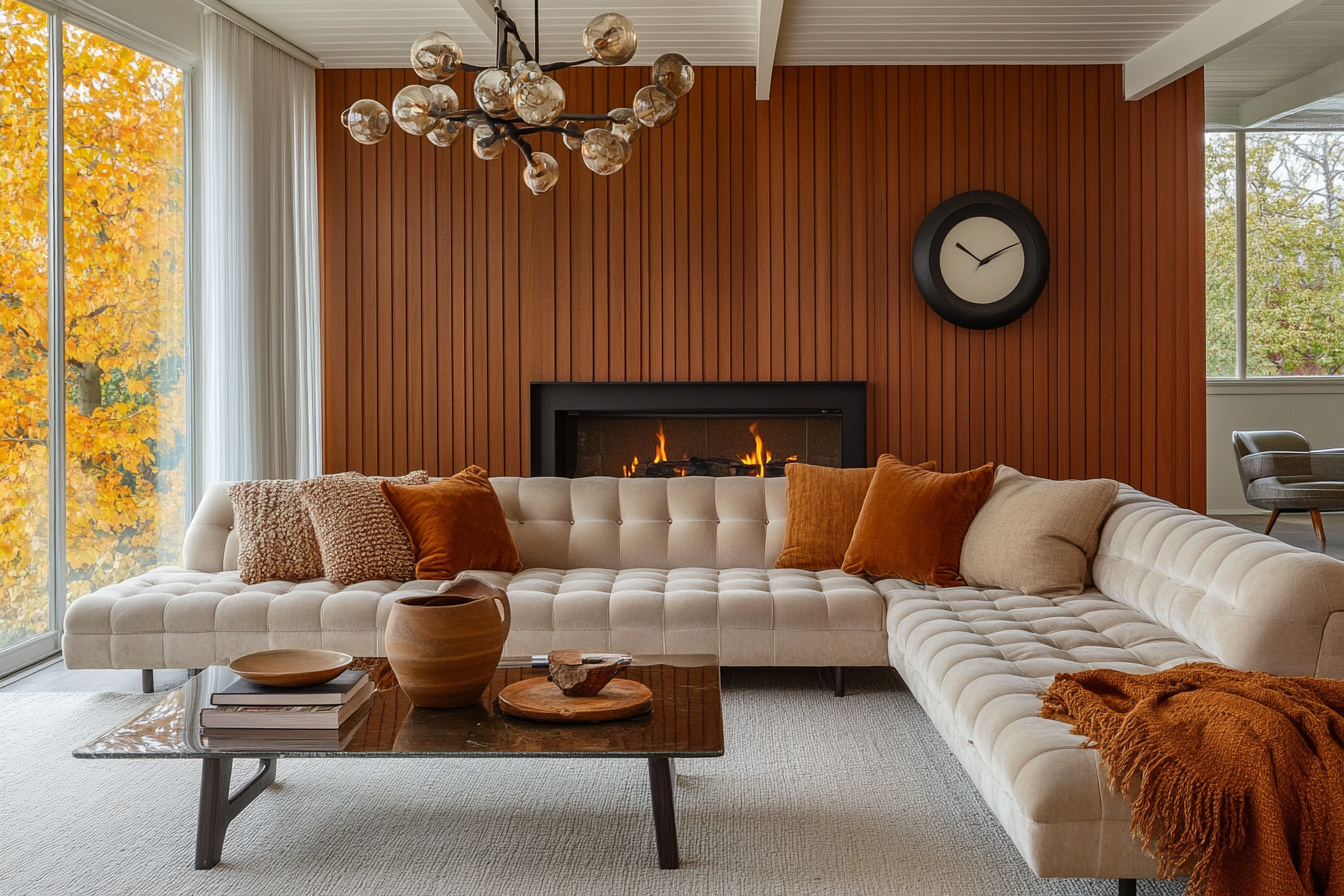 Warm, earthy tones work best for blending with a midcentury palette. A well-placed statement piece above the sofa or fireplace enhances the visual flow of the room.