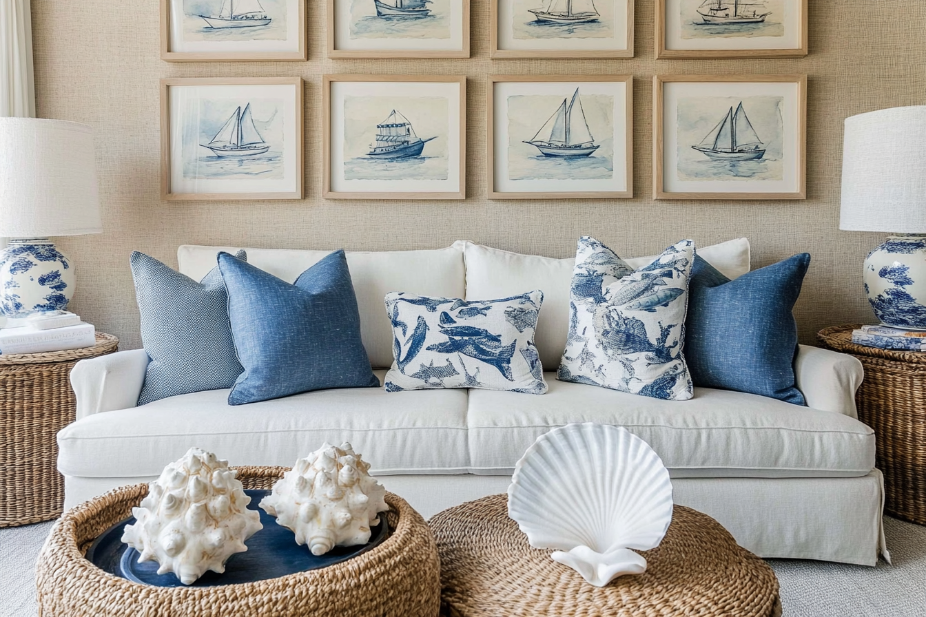 A gallery wall in soft, beach-inspired tones can add personality without overwhelming the space. Combine framed ocean sketches, abstract paintings, and woven wall hangings for a cohesive look.