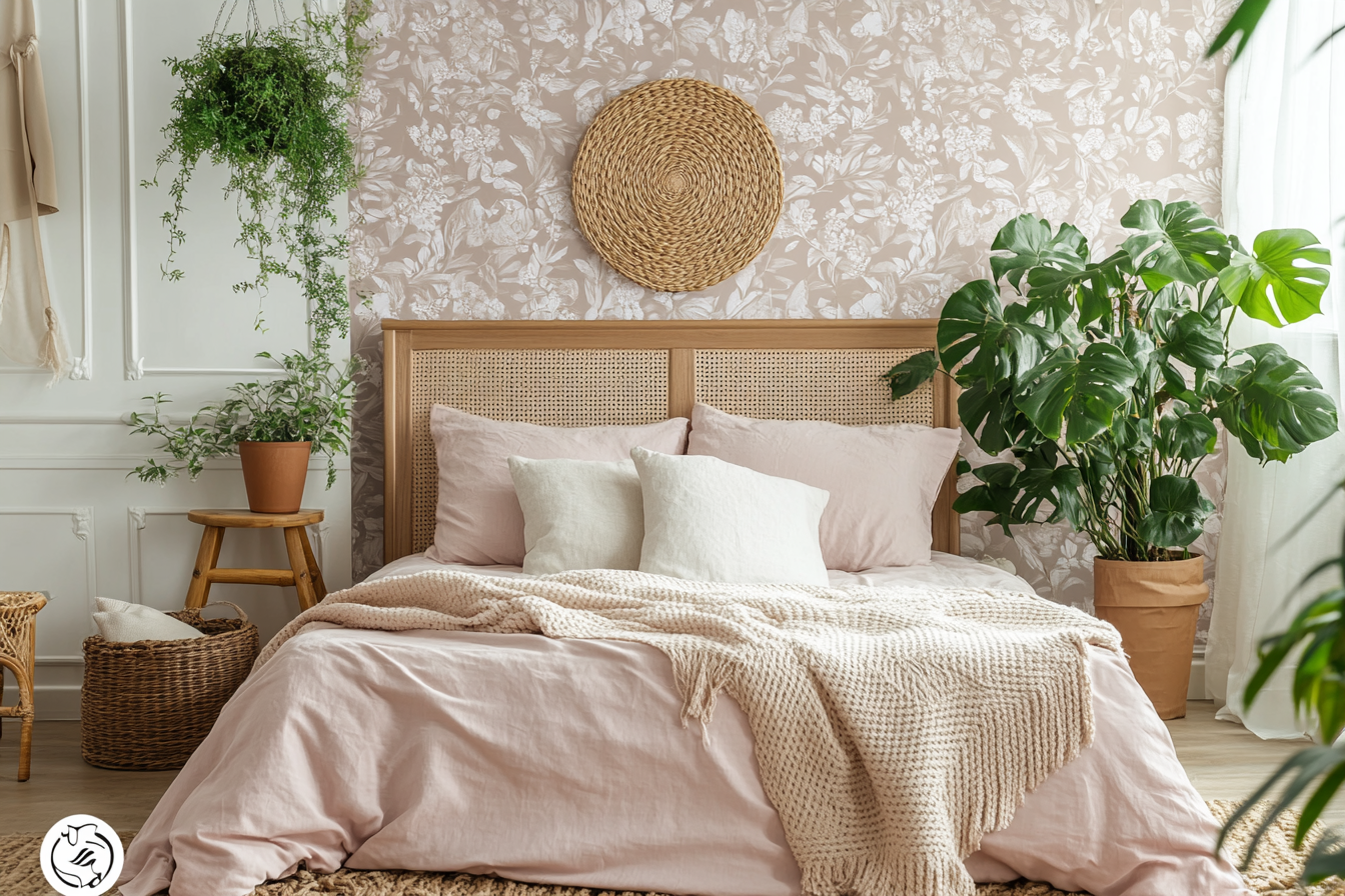 If you love a more laid-back vibe, add bohemian elements to your pink and brown bedroom. Think layered textiles, unique wall hangings, and plenty of cozy throw blankets.