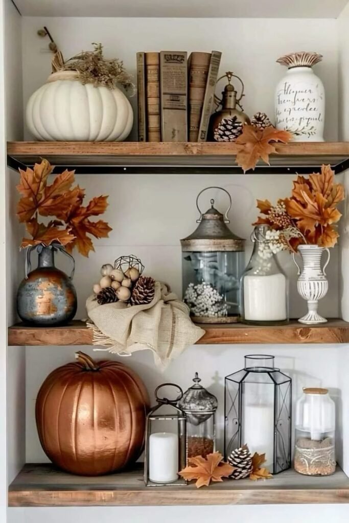 Mix sizes, materials (glass, wood, metal), and colors. Add tiny books or framed autumn quotes in between to make the shelf feel curated and lived-in.