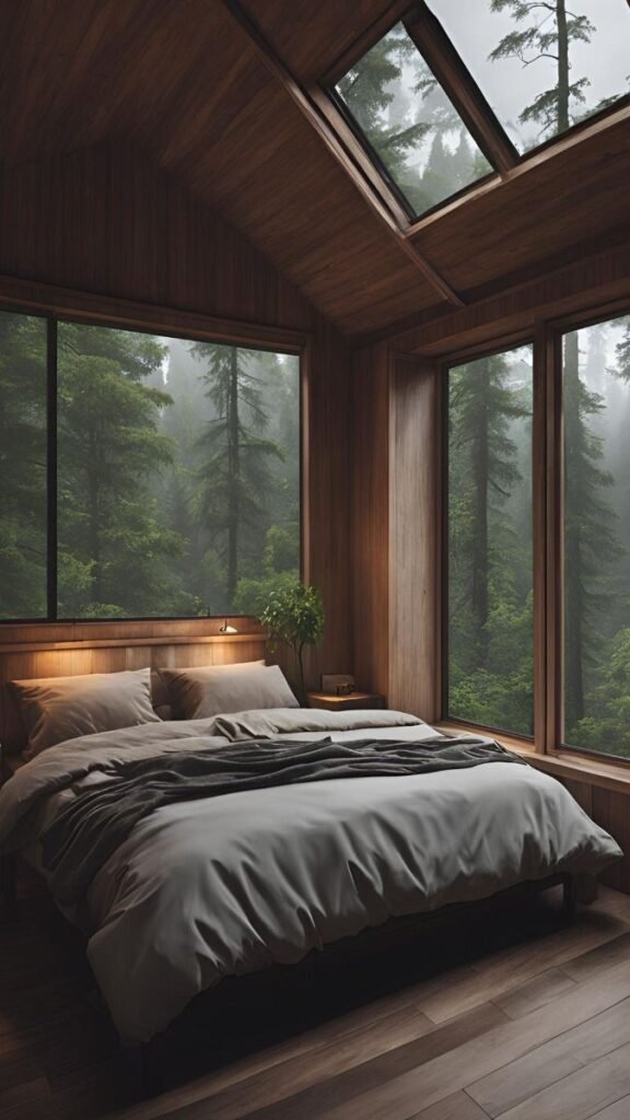 Choose curtains in charcoal, chocolate, or deep forest green. They help amplify that “cave-like” feeling when the rain starts falling and the world outside feels far away.