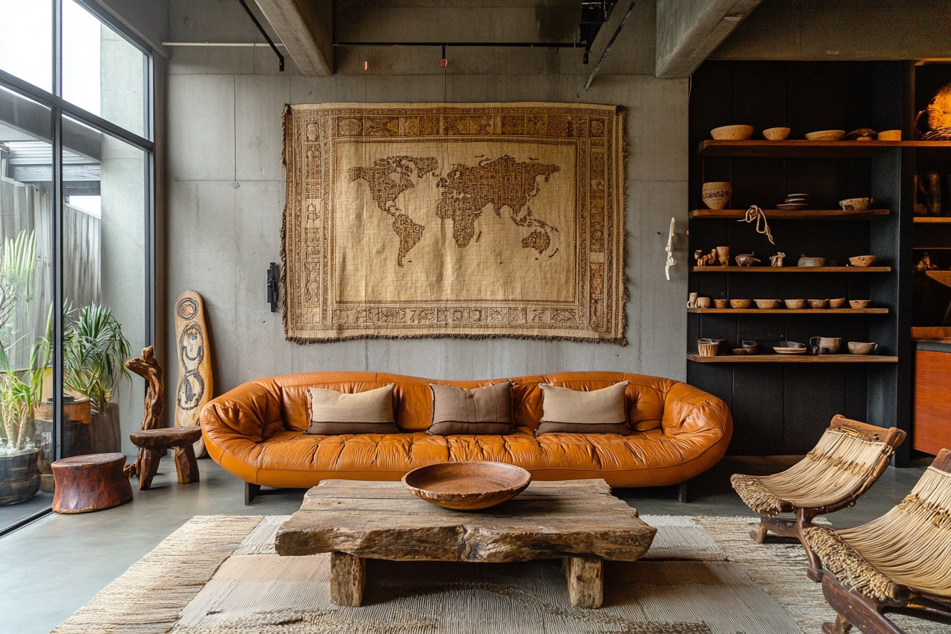 Infusing your living room with a global aesthetic by including artisanal and cultural elements enhances the worldly vibe of boho style.
