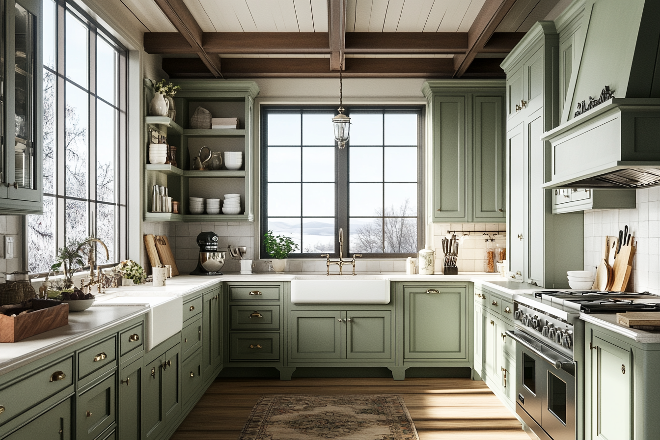 Blending sage green with farmhouse elements like apron sinks and barn doors can create a cozy, country-inspired kitchen. This style brings a sense of warmth and comfort, ideal for a space where you spend a lot of time.