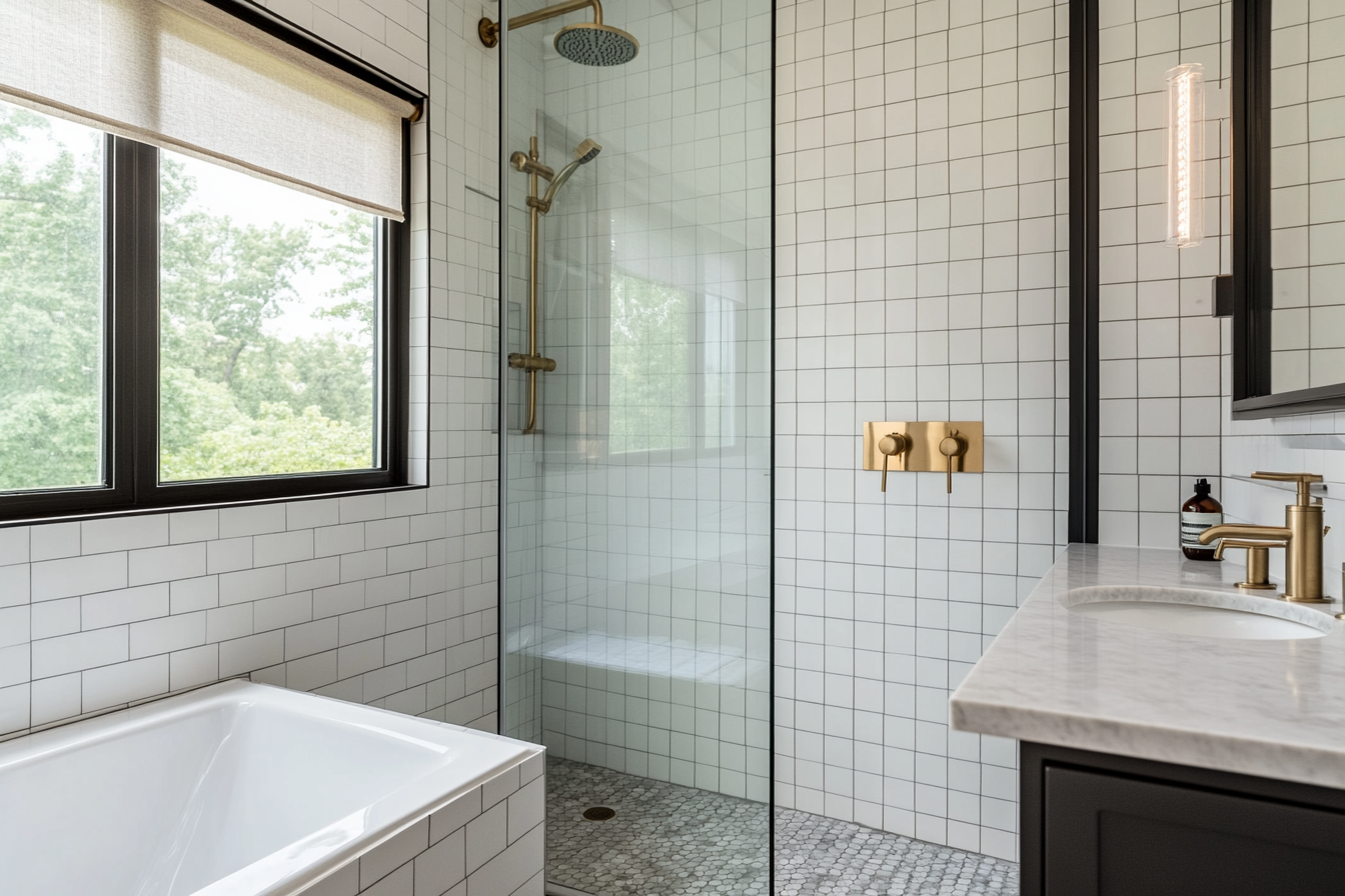 For a modern touch, go for frameless tempered glass with black or gold metal accents. Pairing it with large-format tiles on the walls will enhance the seamless, high-end look.