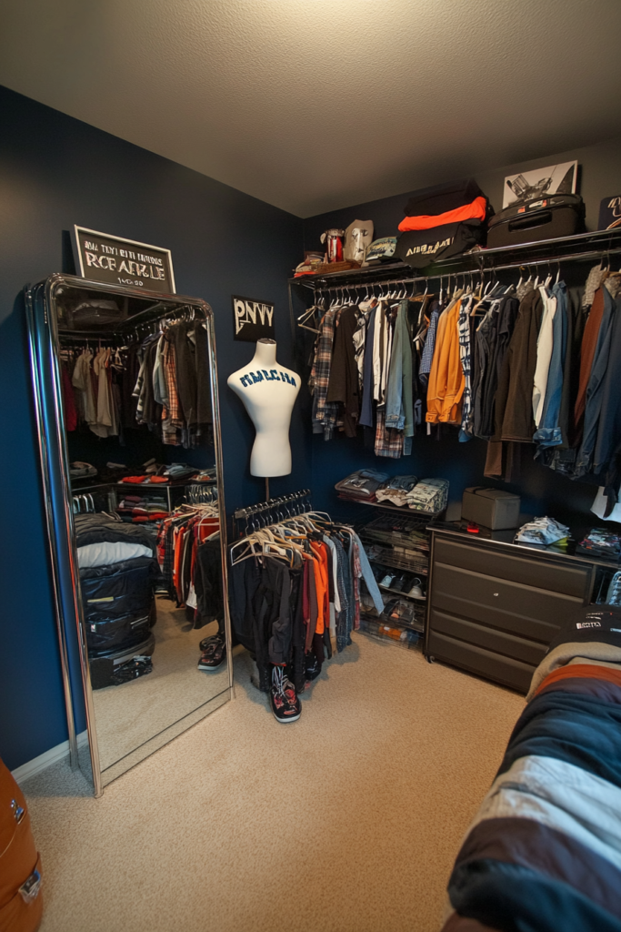 For the fashion-savvy teen, include a full-length mirror, a stylish mannequin for outfit planning, and chic, functional furniture like open wardrobes or modern dressers that highlight his personal style and make daily routines easier.