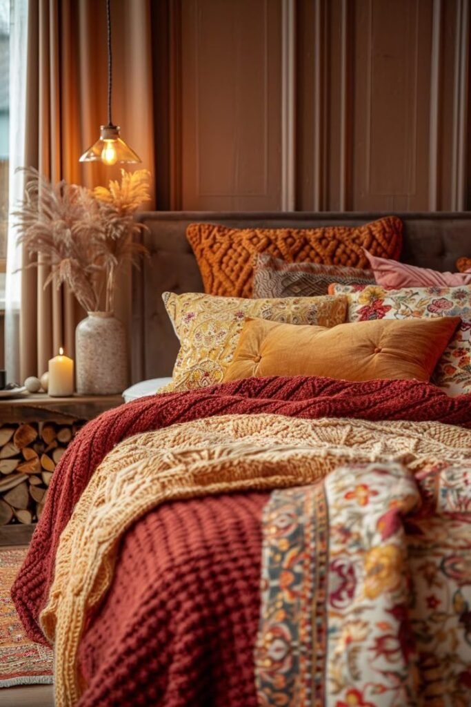 Choose bedding in warm tones—think cinnamon, rust, maroon, mustard, and cream. Layer it with linen sheets and a crochet throw at the foot of the bed. Vintage florals, paisleys, and patchwork patterns add character without overpowering the space.