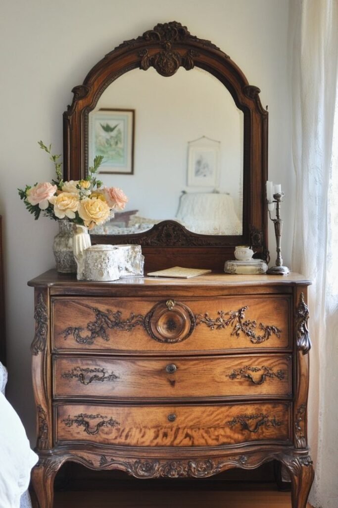 Look for dressers with turned legs, brass knobs, or curved edges. Distressed wood and hand-painted finishes only add to their charm. Top it with a doily, small trinket box, and a few dried flowers.