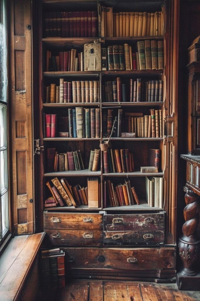 An antique or vintage-style wooden bed frame sets the tone for the entire space. Go for curved headboards, spindle posts, or distressed wood in walnut, oak, or chestnut finishes. These pieces ground your room and instantly bring a sense of age and history.
