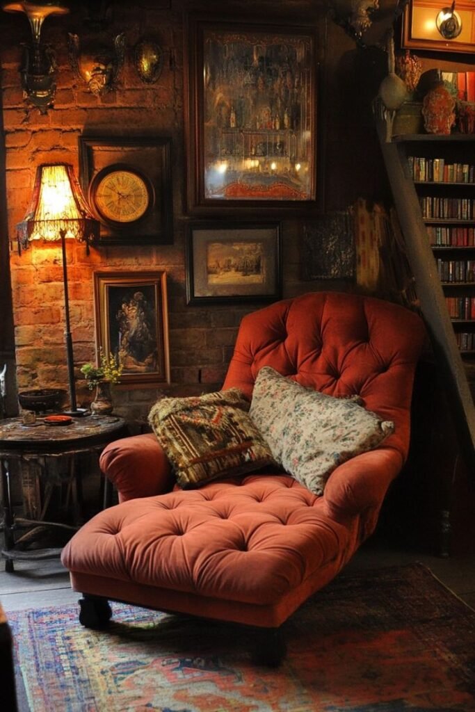 Look for a vintage leather armchair or a velvet slipper chair in a moody fall tone like burnt orange, olive green, or chocolate brown. Drape a throw over the back and place a small side table next to it with a candle or book.