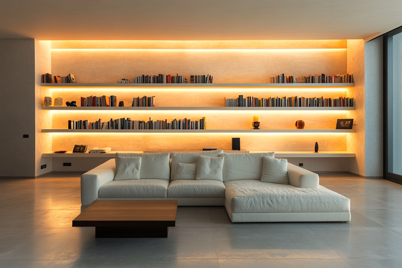 A sleek, technology-integrated space can blend function with style. A modern white couch pairs well with smart lighting, high-end speakers, and minimalist shelving.